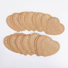 craft paper cards in a heart shape with white printed text. Made from durable cardstock. Shrinkwrap packaging with the sticker. Advice card measures 5" w x 5" h, Packaged cards measure 5" w x 5" h x 0.8" d. Sold in sets of 50.