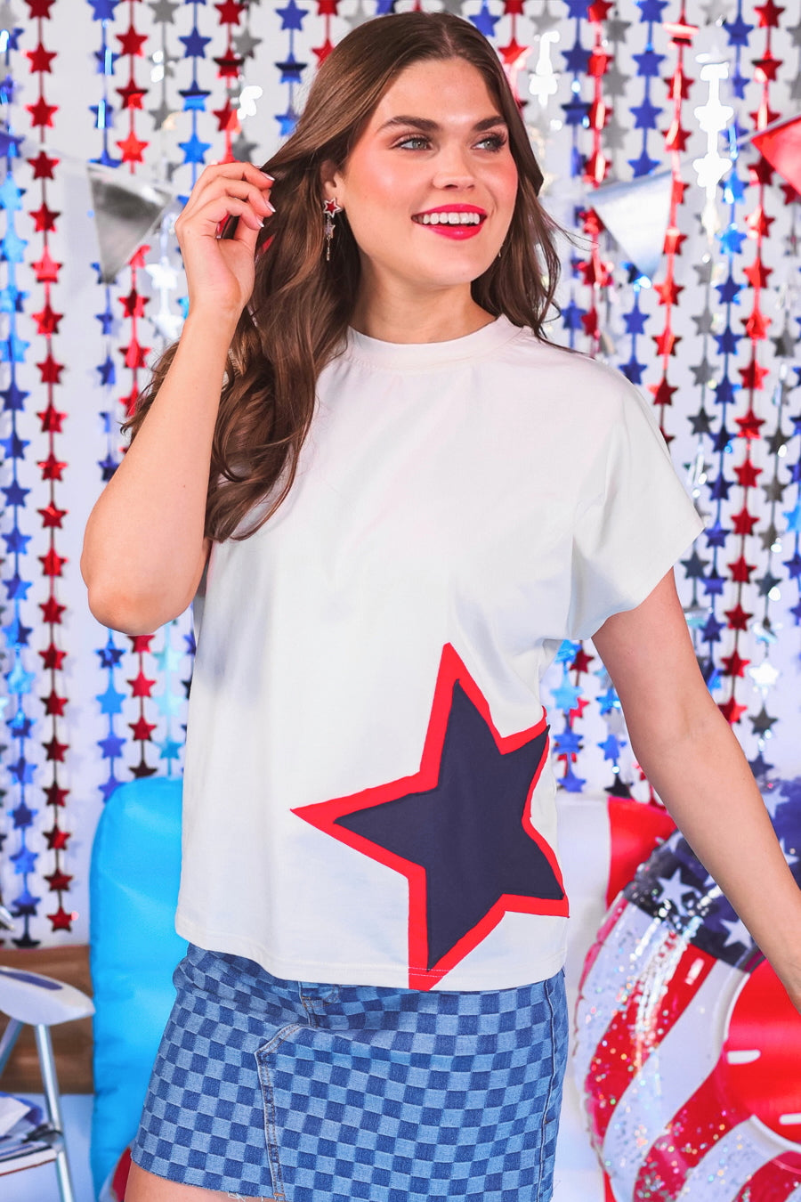 Easy, breezy, and ready for sparklers! Our Simply Patriotic Star Top keeps it cute and classic with soft tee material and sewn-on fabric stars that give it just enough pop. It's lightweight, chill, and made to move.