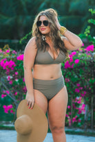 Dive into the fun! Made of stretchy swim material, our Set to Swim Swimsuit boasts thick straps, a triangle bikini top with chunky straps and removable padding, paired with high-waisted bottoms in a sleek, solid mushroom color. Its blend of style and comfort makes it the perfect piece for lounging poolside or diving into adventure. Complete the look with our coverup, sunnies, a beach hat, and a neoprene tote. From lounging to splashing, this set guarantees you'll always be stylishly set to swim. Turn every dip into a statement! If in-between sizes, size UP!